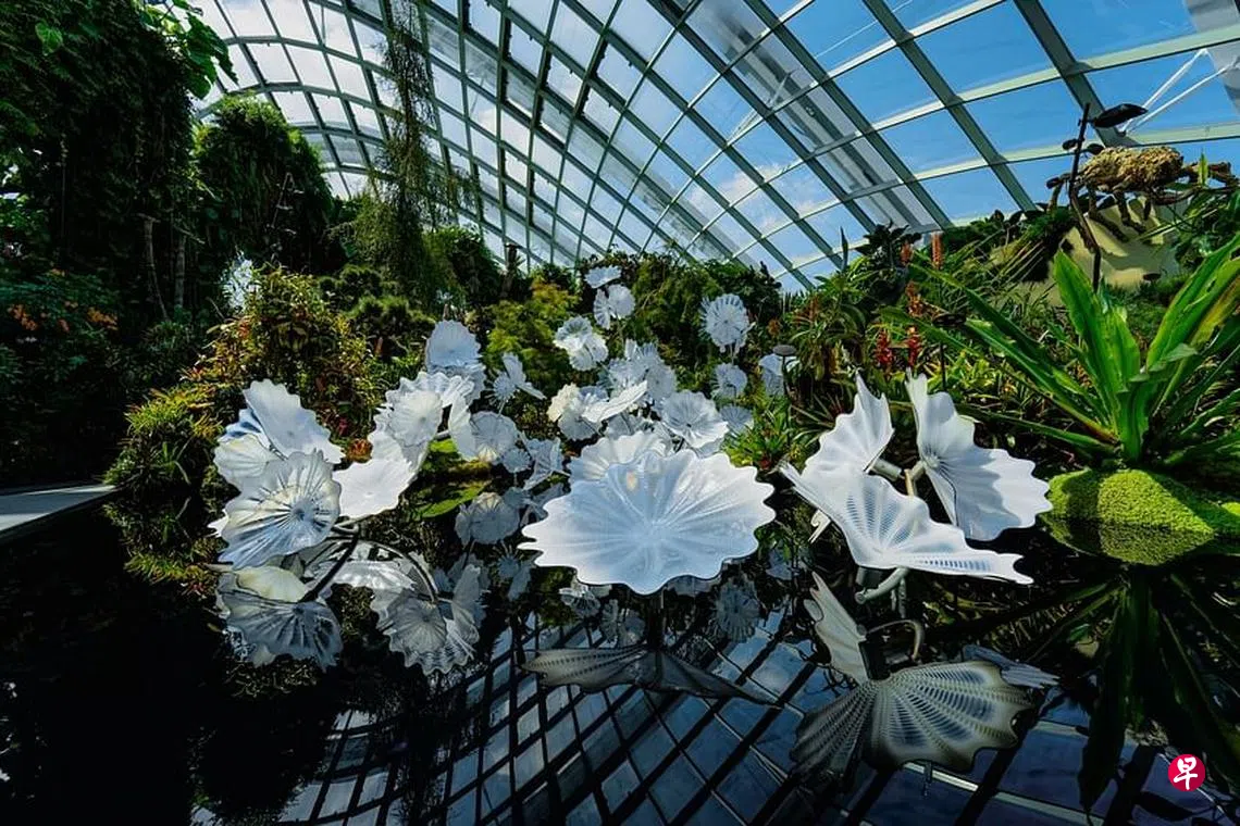 美国知名玻璃艺术家戴尔·奇胡利(Dale Chihuly)去年在滨海湾花园举行亚洲第一个花园展“戴尔·奇胡利:玻璃盛展”,反应热烈。他的最新艺术装置《空灵的白波斯》(Ethereal White Persians)在滨海湾花园云雾林(Cloud Forest)顶层花园永久展出。