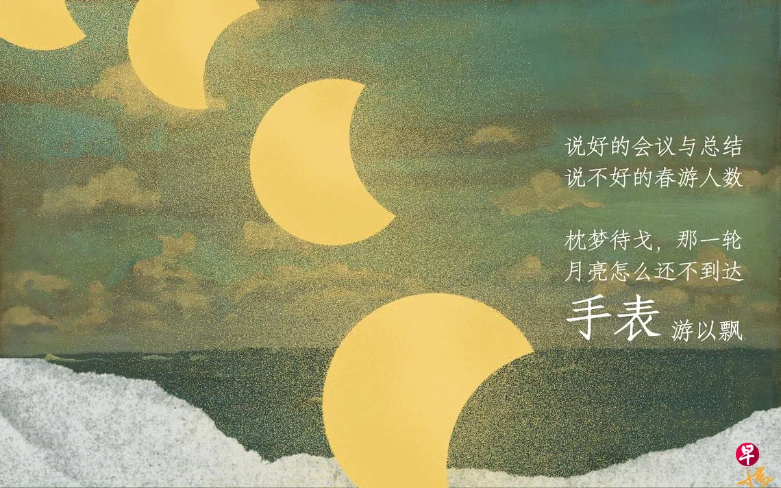 一天与一夜的湖水 降落在左边的手腕 吹皱,波纹与涟漪 浮起,十二个数字 十二个门徒,备忘 或者遗忘一些事情 晚餐,早饭,定点 快乐与忧愁不定时 说好的会议与总结 说不好的春游人数 枕梦待戈,那一轮 月亮怎么还不到达 右边,临阵的包括 风声,草木,云水 变卦与否,举手或 翻手,端看或无视 长针,与短针一起 征逐,从来不逆转