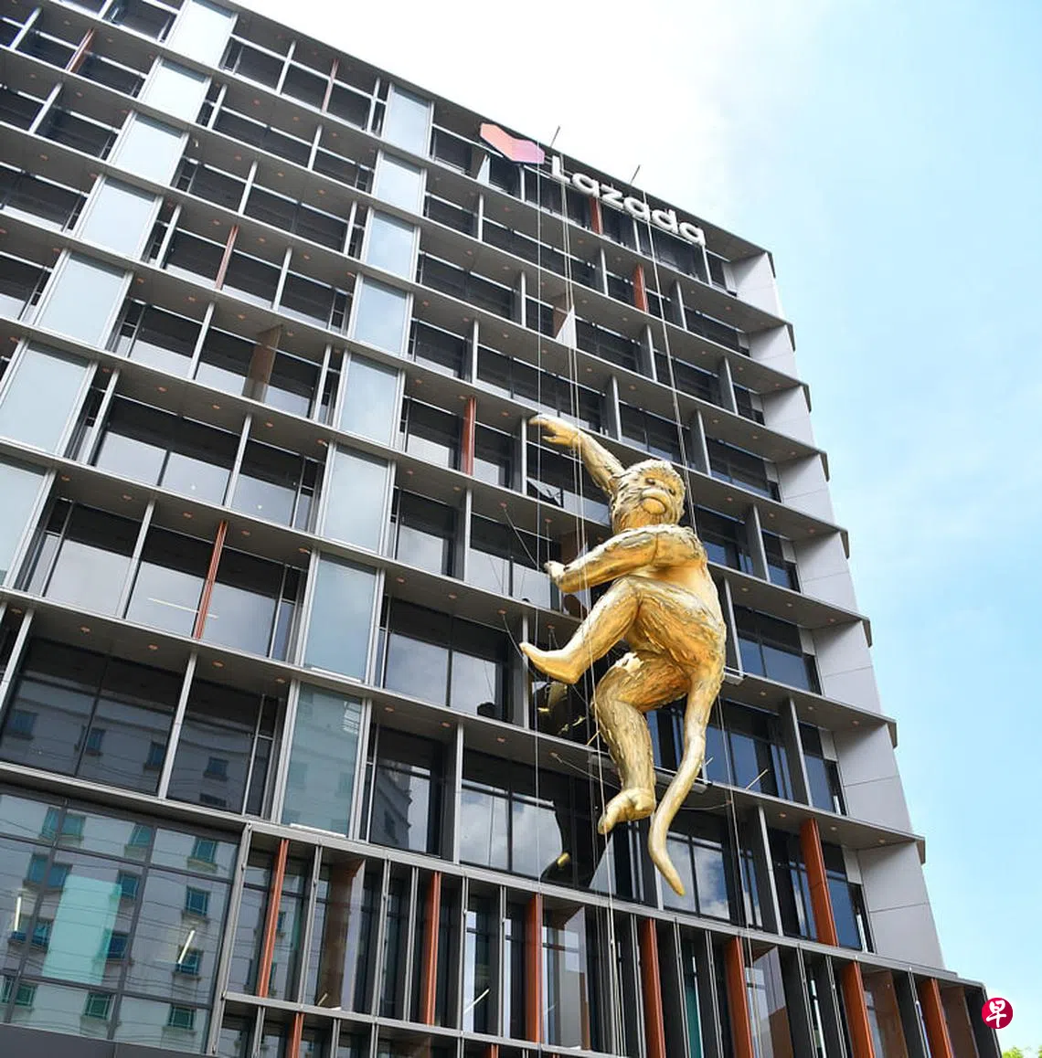 勿拉士峇沙迎来新“居民”——一只14米高的巨型充气雕塑《金猴》攀爬在Lazada One大厦外墙上,离地面五层楼以上。