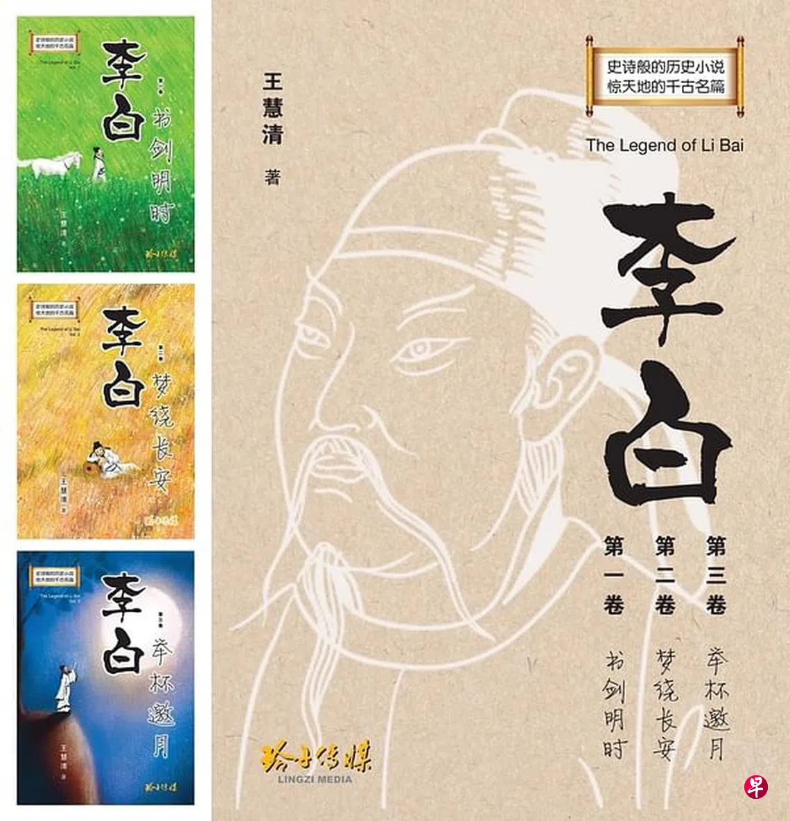 中国作家王慧清的长篇历史小说《李白》最新版分三卷,共65万字。玲子传媒版封面由新加坡插画家余广达创作。作者王慧清用21世纪当代人的目光穿越1300年历史,重构大诗人李白浩气磅礴的一生。本书曾被改编为45集大型历史电视连续剧《李白》,王慧清亲自参与剧本改编。《李白》全书描绘了李白辉煌的文学成就,惊涛狂浪般的感情世界,傲视权贵并为崇高理想奋斗不懈的精神,揭示李白鲜为人知的家世和绮丽浪漫的爱情之谜,同时刻画了杜甫、孟浩然、王维、高适、陈子昂、郑虔、张旭、吴道子等艺术家群体的互动。