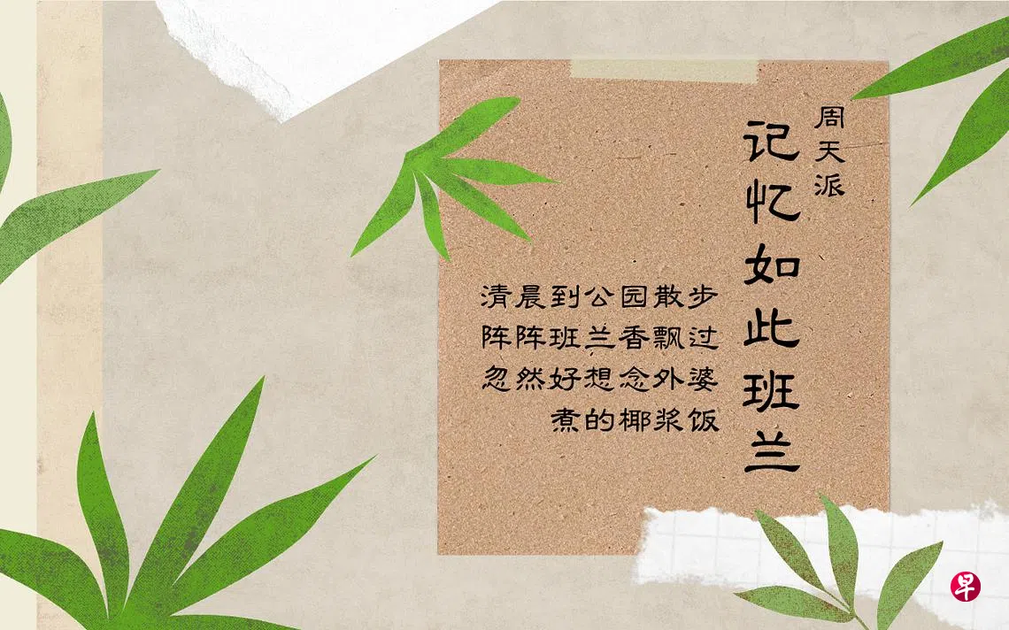 清晨到公园散步 阵阵班兰香飘过 忽然好想念外婆 煮的椰浆饭 班兰叶唤醒饭香 公园瞬间透亮 肚子咕噜咕噜 孩子般吞咽全世界 此刻看见童年的我 同时抵达未来回望 有些时刻不断重返 更多时刻随风消散 我们只能活这么一次 这是多么美好的哀伤 又是多么哀伤的美好