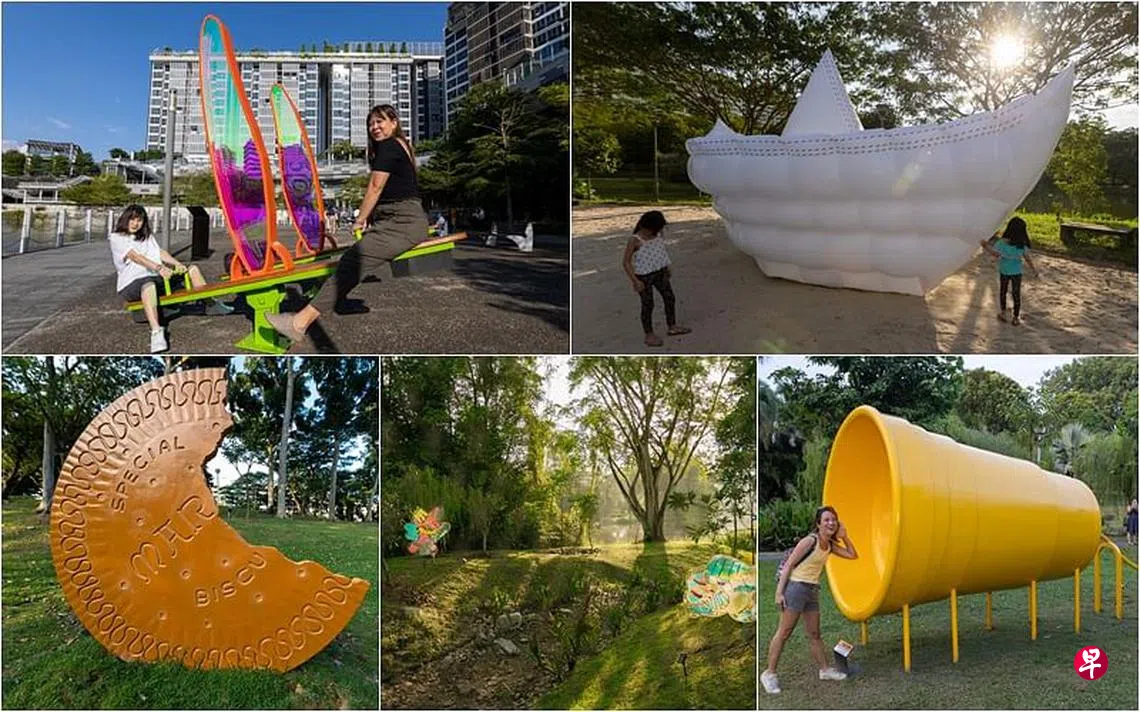 一组形状古怪的装置散落在裕廊湖公园的草坡上。它们模棱两可,像异想天开的梦泡泡,俏皮地从地上冒出来,在阳光下闪闪发光的鲜艳色彩也像飞翔的花蝴蝶。