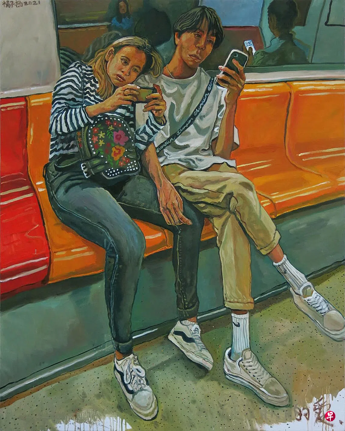 画里的一些面孔是基于他可能是“偷拍”的戴口罩的陌生人照片和网上搜索的随机面孔的合成;有些身体的四肢是从另一个人身上缝合而成的。作为具象画家,他思考这样的画是否仍可以被视为“肖像”?真相对观者来说可以延伸到什么程度?就像展览的反讽正标题一样,副标题中“想法”“关于”和“人物”的非标准化缩写诙谐幽默,是当今主流的SMS拼写方式。杨子扬画中描绘的人物和地点,是人们倾向在社交媒体发布迷人(通常是虚构的)生活的对立面。