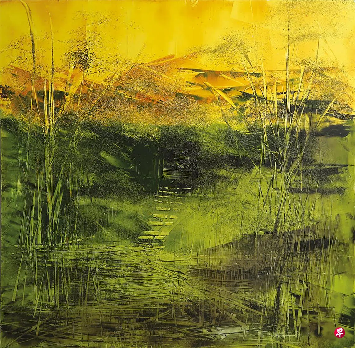 邓国富自1996年开始实验采用浸在水里也不会破的亚克力板作画,觉得油画画在亚克力板上比较有时代感。他结合油画、水墨与水彩画的技法,对每幅作品的要求是达到“语、透、流、震、变”。对他来说,绘画就是一种语言的表达,作品必须要说一个故事,画家表达一个故事或一段经历,一个回忆或想法,访观者从中感受到画家的思维或心情感受。