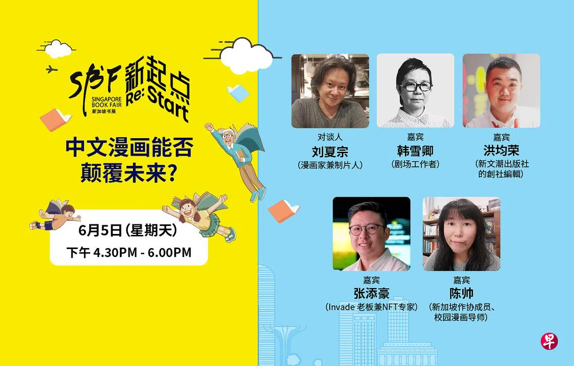 刘夏宗:中文漫画能否颠覆未来?跳班漫画家刘夏宗及资深剧场工作者韩雪卿女士, 得奖作家陈帅女士,新文潮出版社创社编辑洪均荣先生以及 Invade 老板兼NFT专家张添豪将讨论本地的中文漫画创作未来发展的可能性与颠覆。 漫画新加坡书展新加坡书展2022直播特别企划上一篇亚洲文明博物馆 《四海汇风华》——我们的故事下一篇张力奋《牛津笔记》分享会