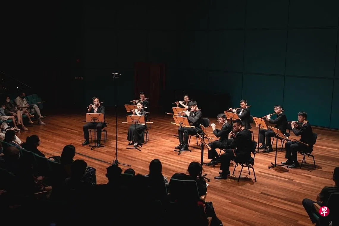 从事华乐专业那么多年,这是我出席过最难得的演奏会之一。音乐会形式从独奏、二重奏、三重奏发展到10把笛子的室内乐重奏。整场演出笛团的每一位孩子都尽心尽力地演绎本地和海外著名作曲家高埃里克·沃森、蔡宗玲、高程锦、任重、李霓霞和梁洁莹新近委托创作的作品。除了上海音乐学院作曲系博后李霓霞所作的笛子四重奏《雨滴》和由台湾作曲家任重作曲的笛子独奏《年年》,其他八首曲目都是本地和世界首演。对于一支非专业,由志同道合者组成的笛团要演绎那么多首曲目的确很不容易,但他们的演绎正是为新加坡的华乐奏响别具一格的最强音。值得一提的是在笛团团长黄显行、副团长陈俊强和驻团指挥王翔乐的领导下,笛团不惧困难,挑战新曲目,成功举办了这次的音乐会。