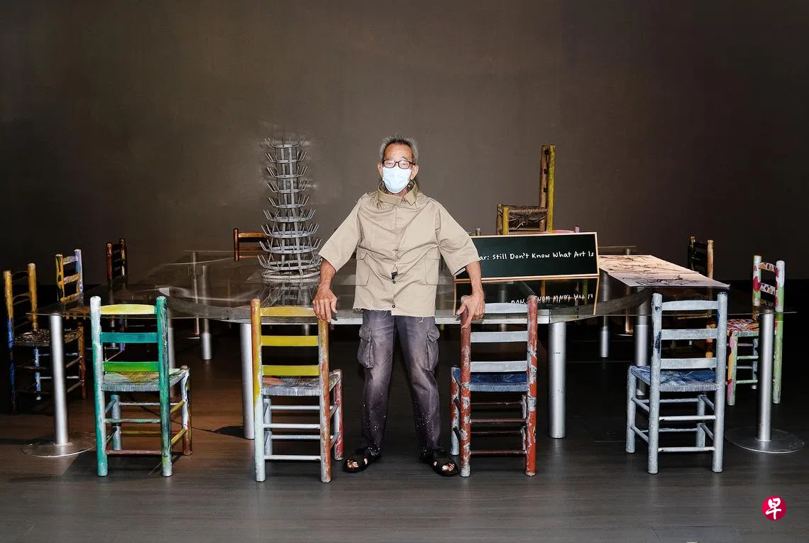 我国知名当代艺术家唐大雾(79岁)将平时穿的卡其裤改缝成上衣,在最新个展开幕礼从头套上做了表演,也穿来接受《联合早报》采访,破除“这样做很倒霉”的想法。他拍照时也坚持戴上口罩,因为现实是我们仍被疫情困扰。