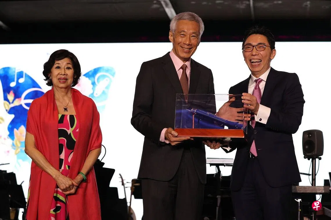 新加坡华乐团赞助人李显龙总理以主宾身份出席星期五(10月7日)晚上于丽思卡尔顿美年酒店大宴会厅举行的筹款晚宴暨音乐会。晚宴筹得善款94万6500元,将悉数获得文化捐献配对基金,补助乐团的发展和营运开支。