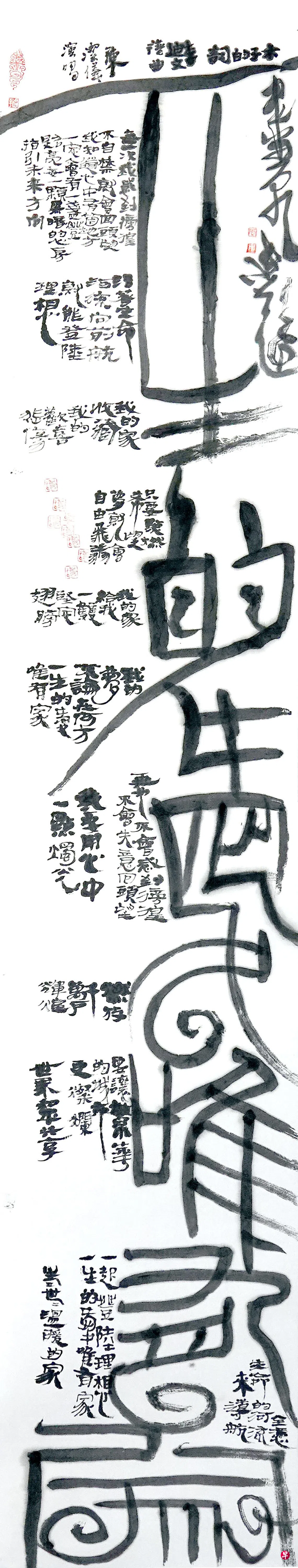张爱强受访时说:“无论传统或现代书法都想尝试。传统是源头活水,让作品有多种可能性,加入现代句子或其他形式,形成画面的冲击力与视觉享受。中国书法从明朝开始,从案头的人文画演变成大画,让观者有更强烈的印象。”