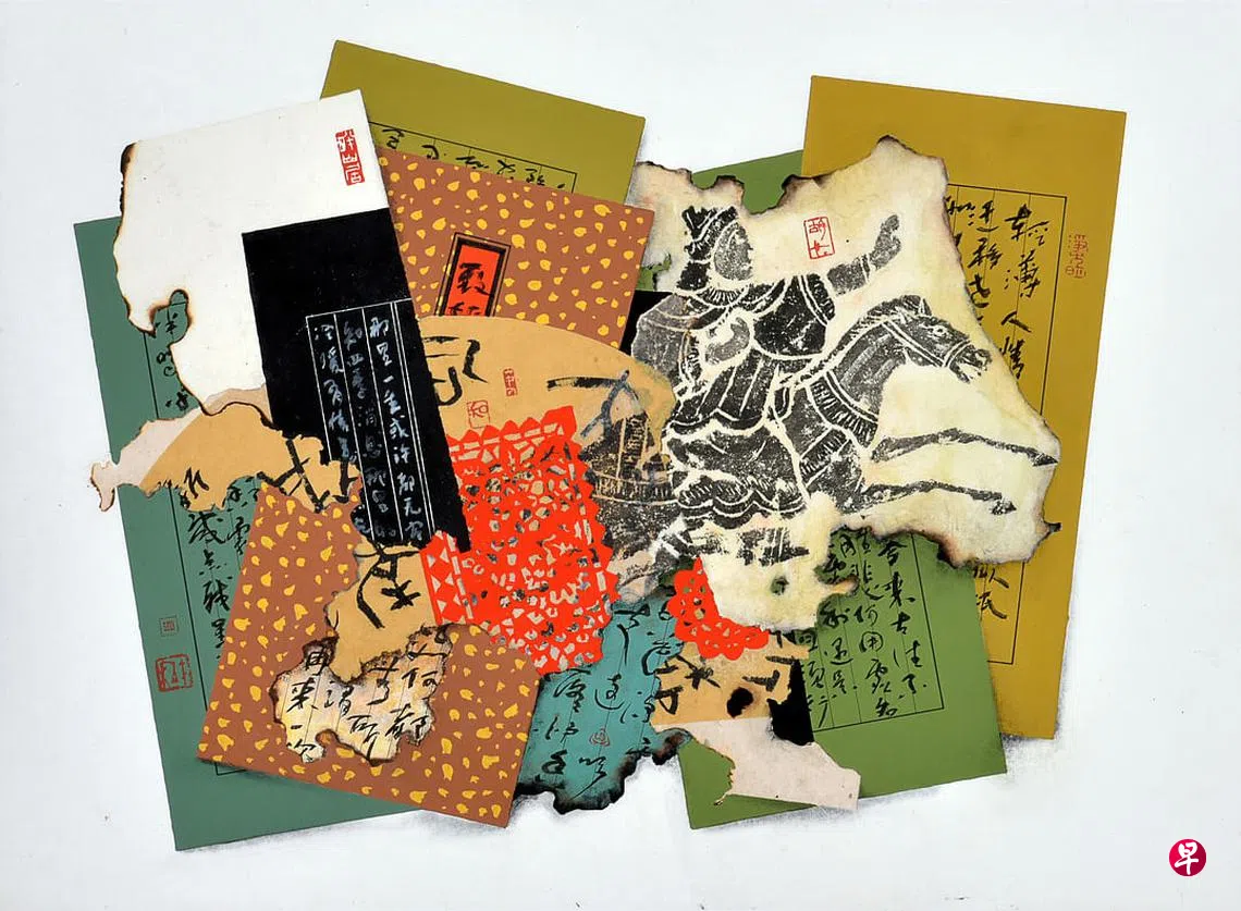而今这种艺术形式没人延续,新加坡艺术家胡财和(63岁)最新锦灰堆个展“今夕何夕”是有意思的尝试,展出的38件作于2019年至2022年的拼贴与混合媒介作品,取材文人书房打翻了的字纸篓,赋予当代的情绪感觉。