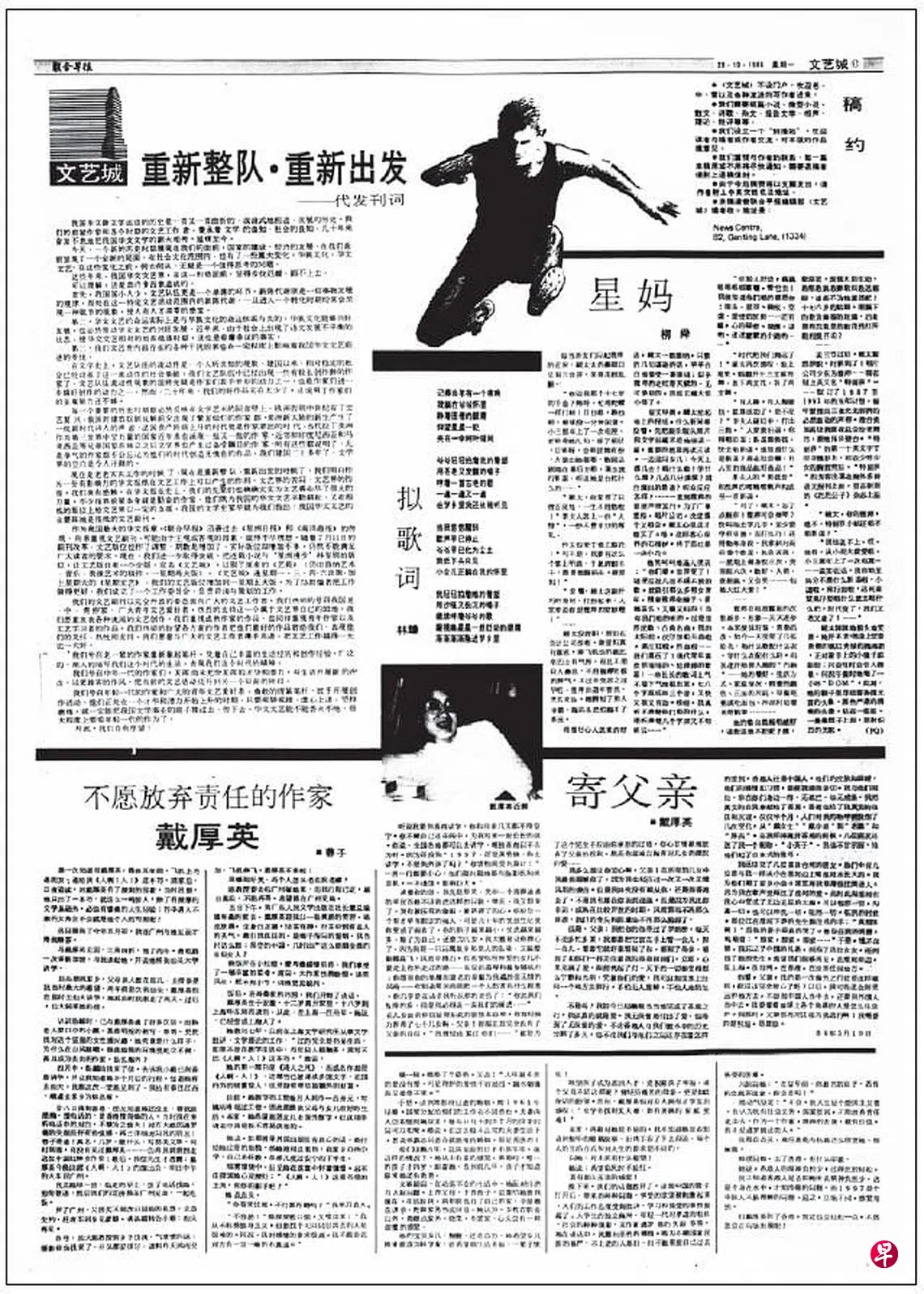 1986年10月20日《文艺城》发表《重新整队·重新出发——代发刊词》,文章充满紧迫感,除了表明本地语言的不平衡发展导致文艺萎靡,更遗憾地说:“我们建国二十多年了,文学界的空白是让人汗颜的。”
