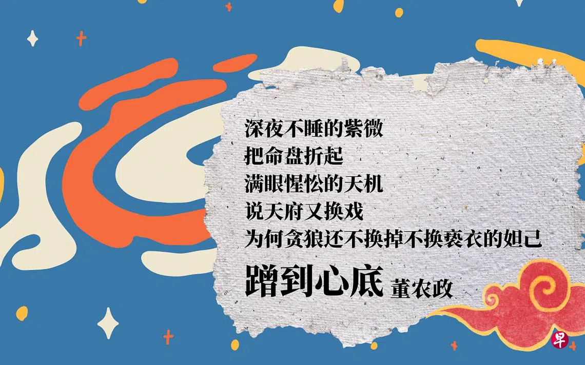 我曾蹭到你心底 听过你的偈 全是紫薇睡下的径 翻过一季又一季 雲走过 风留下 猫走过 狗留下 你走过 我留下 或者完全反调 走过的留下 留下的走过 深夜不睡的紫微 把命盘折起 满眼惺忪的天机 说天府又换戏 为何贪狼还不换掉不换亵衣的妲己 一切佛 是纣王摘星楼中比人高一些的神木案几 不便翻经 翻狼烟与战戟 翻炊烟与生计 一只素蝶厌恶了七彩翻飞 我嘛! 疲惫于翻出或紅或黑的心 子牙把我化了忌 化了忌