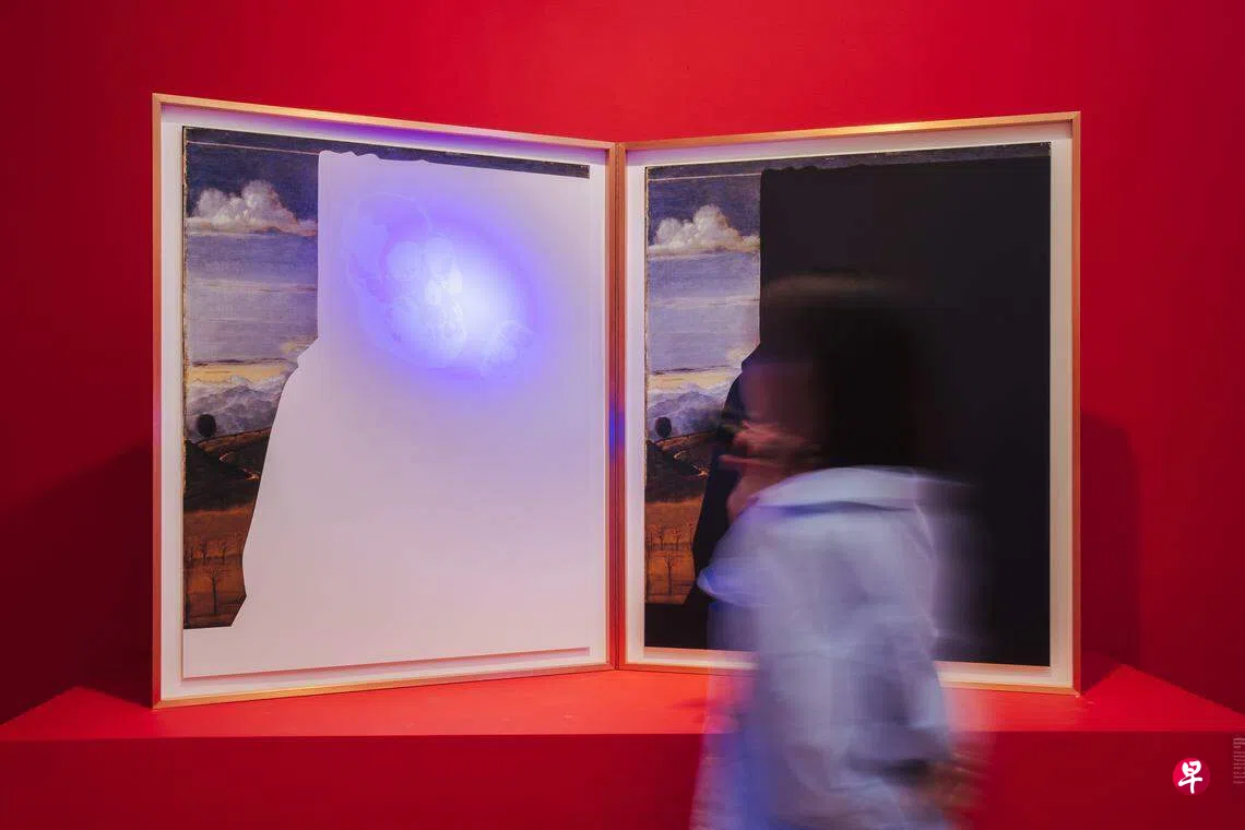 艺术家里克力为本地媒体导览时说,作品以太阳能粉尘墨水创作,打印后,图案会消失,只在日光下或以紫外线照射才能显现。本次个展,他通过40件作品来探讨灭绝的主题,其中一个系列挪用西方经典油画再创作,质疑背后的叙事观点——启蒙运动加剧了自然与文化的鸿沟,而人们对科学与知识的渴望,削弱了对自然生态中,非人类生命形式的尊重。