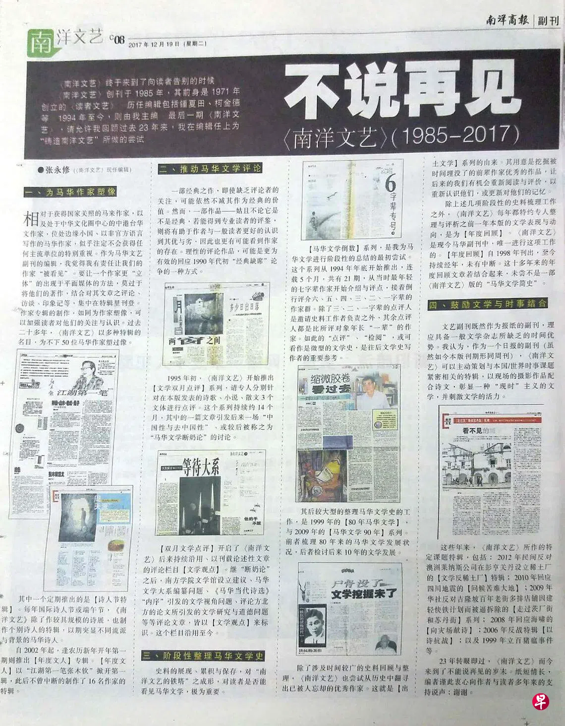 2017年12月,马来西亚《南洋商报》文艺副刊《南洋文艺》休刊,主编张永修“不说再见”,总结《南洋文艺》1985年至2017年的文艺实践,“纸短情长”,向读者道谢,不亢不卑。