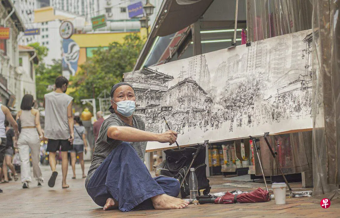 本地水墨画家邓汝能(64岁)“常驻”牛车水10年,在街头写生作画的集大成作品是长18英尺(548厘米)、高95厘米的水墨长卷巨构《人长久》,边走边看富于变化的牛车水市井风俗画卷。