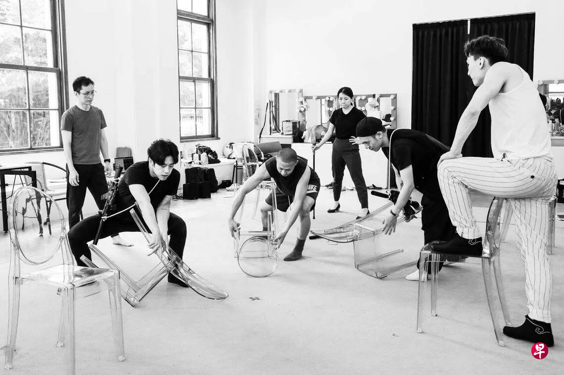 在排练的过程中,剧团也不断设想应用戏曲元素的可能性,将京剧的节奏、台步和唱腔等美学拆解应用,或混入现代元素作为对峙和反差。在谢燊杰看来,兴传奇的创作方向主要带观众走近京剧,但这次《八仙变数》却是反过来,试验京剧元素能为现代戏剧,甚至近未来题材提供什么养分。在科幻摩登的妆造下,我们见到两批演员的能量交汇,对于编导已经回答太多次的问题——“本剧的戏曲成分有多少?”,答案大概很难用百分比数字来量化。