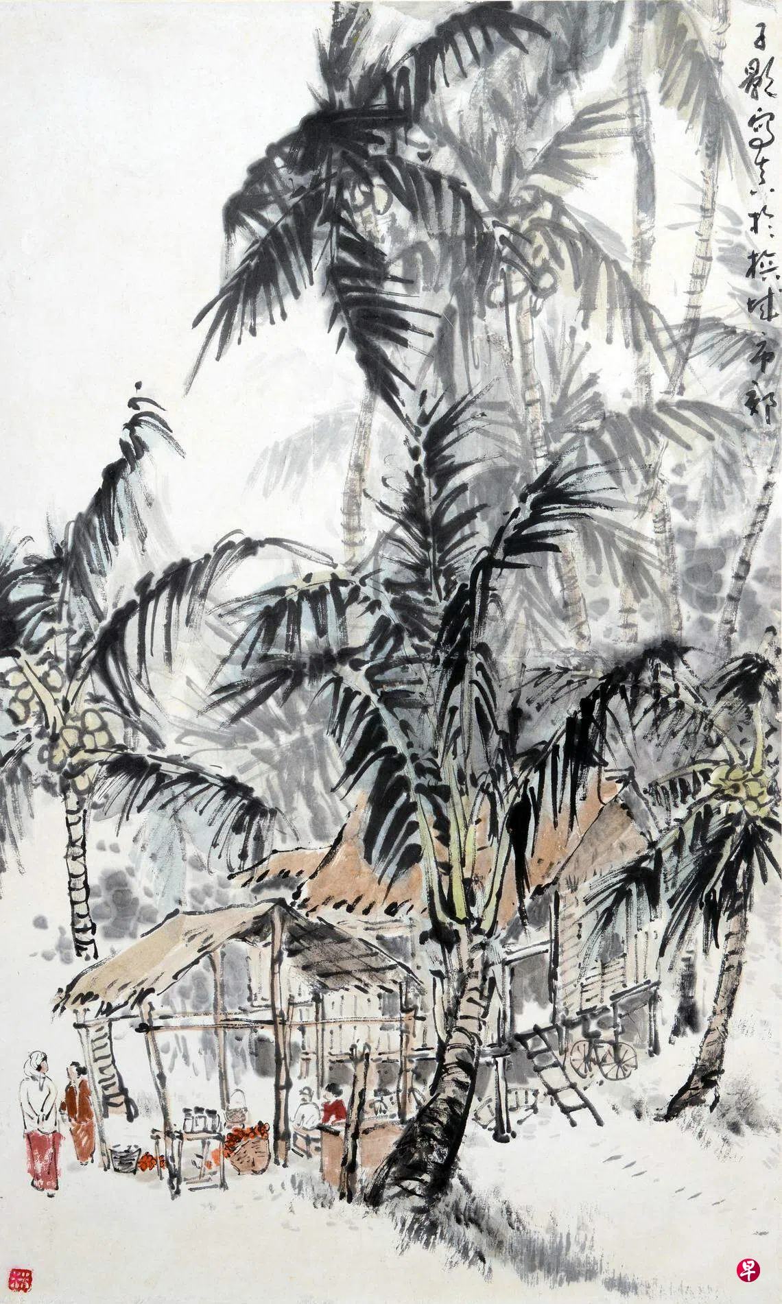 林子影作品笔墨、用色与布局可看出海派绘画功力,以山水和花鸟最为突出。其山水画虽有中国名山大川,但多为东南亚风景,笔下马来村庄、小桥木船,河边嬉戏的马来妇女,迎风飘摆的高耸椰树都是地道南洋景色,设色清雅,笔墨淋漓。
