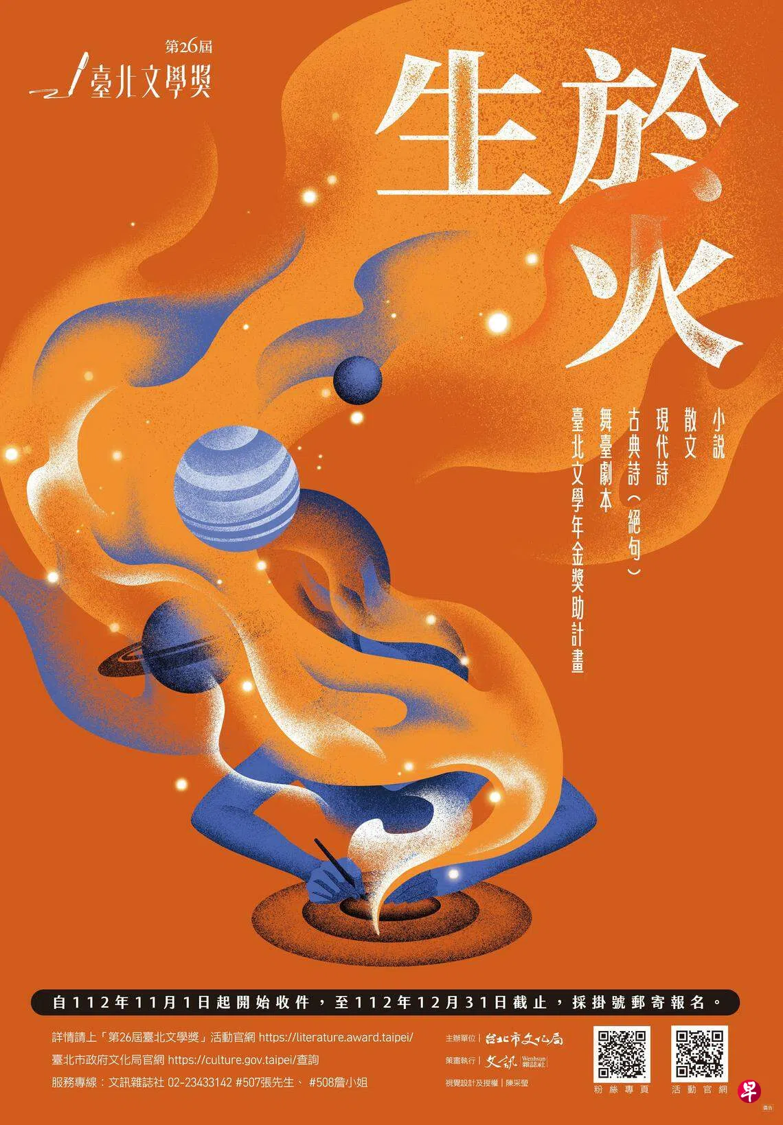 第26届台北文学奖以“生于火”为宣传主题,即日起接受投稿,2023年12月31日截止。