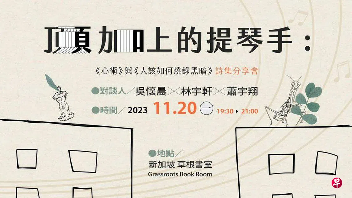 “顶楼加盖”是台湾都会的日常风景,不合时宜的诗人,有如顶加上的提琴手,在破败的危楼风景中,透过一己的旋律和语言,向彼此传声定位。台湾年轻诗人萧宇翔和林宇轩将在南洋理工大学现任驻校作家吴怀晨的引领下,在狮城一同回望岛屿写作中,顶加人生的弓弦诗学。