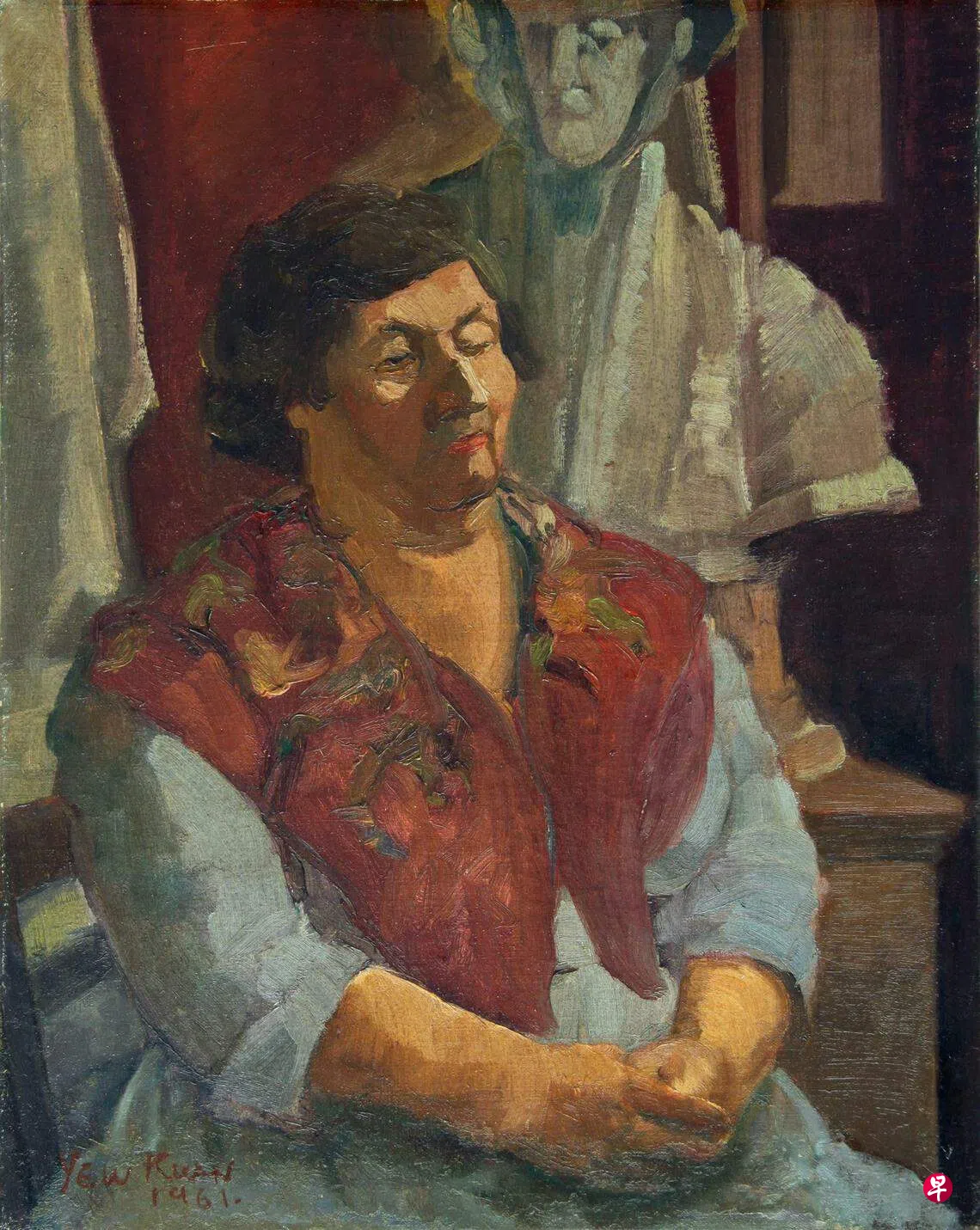 作品来自林友权家属,作于1952年至2015年期间。其中六幅是林友权于1958年至1961年就读英国伦敦切尔西艺术学院时期的作品,难得一见。作于1959年的静物油画《静物与梨》(86x65厘米),取材形体浑厚黝黑的日常器物——罐子钟座酒瓶,与桌下的梨子构成视角,功底扎实。《穿红马甲的女人》(70x55厘米,1961),描绘劳碌一生的妇女的神情面容。