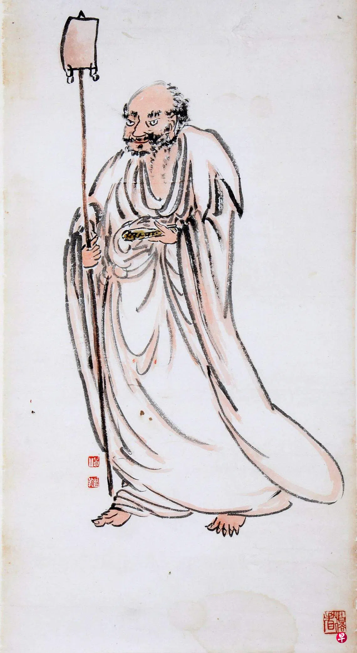 范昌乾以兰竹作品最受人称道,作为全能型的海派艺术家,他涉猎的题材范围相当多元。他的人物画数量稀少,本次展出五件,其中一幅精品《白袍达摩》,足见范昌乾老道的笔墨功力,白描精到,笔触潇洒,寥寥几笔,人物神态活灵活现。其他人物画《蕉旁高士》《夕阳漫步》等,借助高士形象,寄托“怕俗”的“园丁”内在高雅境界。