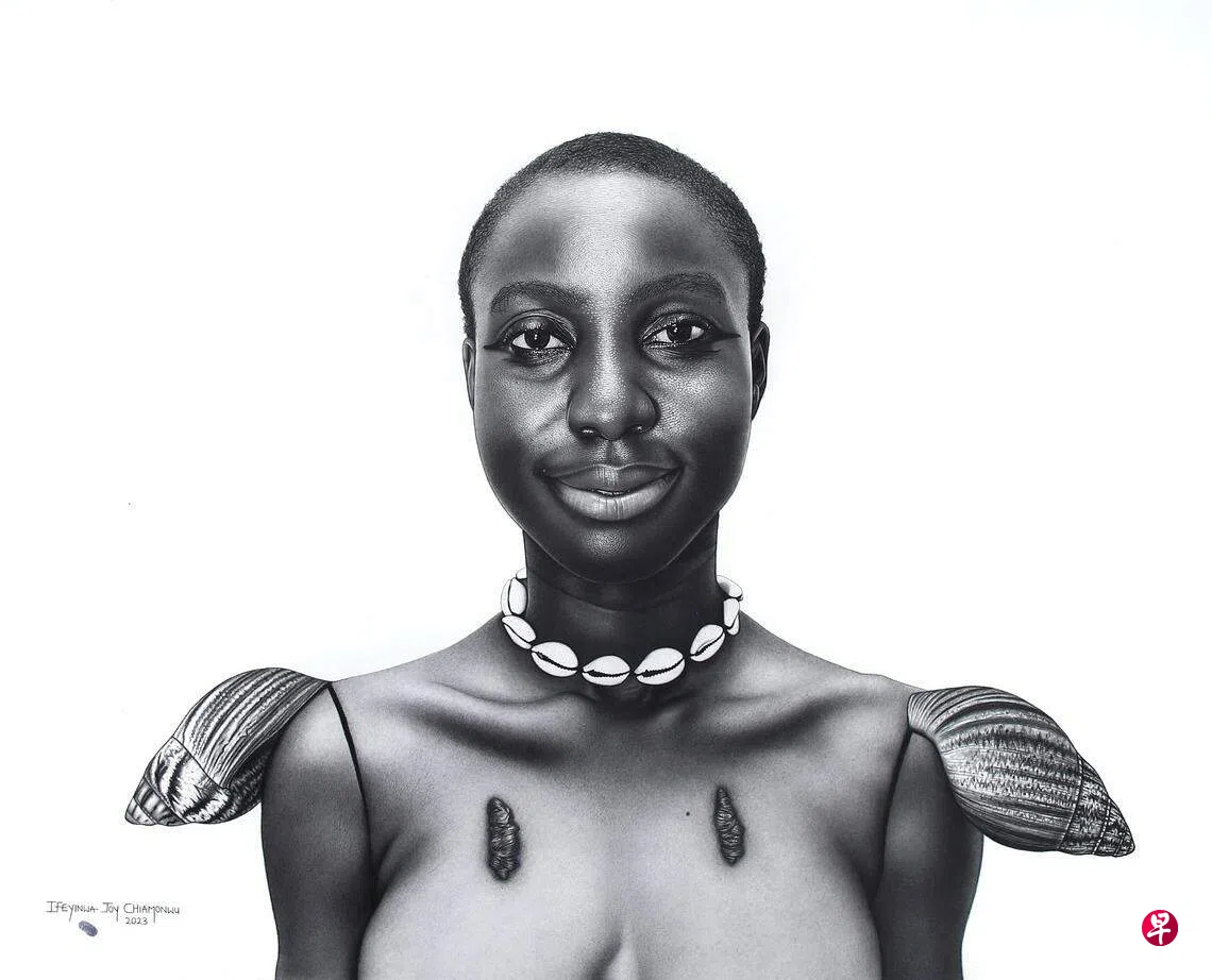 新加坡艺术家陈彦云《伤痕书写》(2023),在薄钢板上蚀刻疤痕的痕迹,像中国竹卷绑在一起,暗示身体伤疤是一种语言形式。尼日利亚艺术家Ifeyinwa Joy Chiamonwu的木炭画“Olaedo”(2023)也描绘一位年轻非洲女孩自豪地炫耀胸前凸起的伤疤,艺术家说:“在非洲社会,疤痕疙瘩受到公开欢迎,并被自豪地接受为我们身份甚至地位的一部分,取决于人们如何获得它们。”