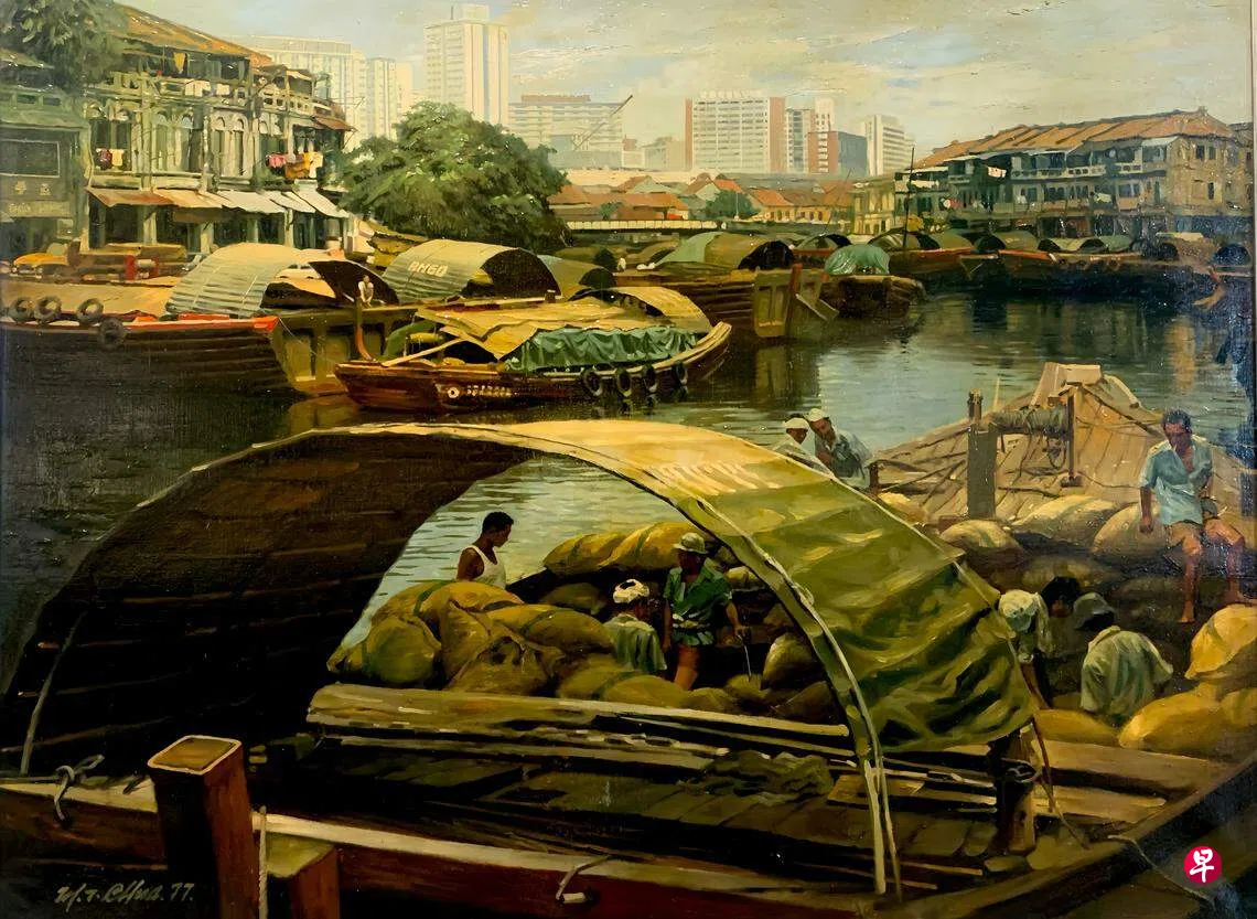 蔡名智1931年生于汕头,六岁时因日军侵华,随从商的父亲南来新加坡。他八九岁时在河边做过小贩,帮补家用,笔下的新加坡河是从现实生活中产生的深刻感触,容易产生共鸣。蔡名智作于1977年,描绘新加坡河的作品突出了船上搬运货物的劳工,1983年的油画则突出驳船停泊的河边新冒出的高楼大厦,带出新加坡河的清理与城市化发展。