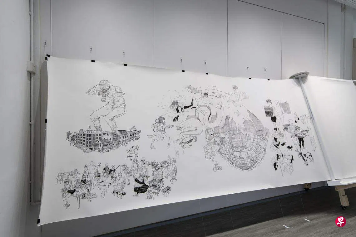 患自闭症的艺术工作者李智荣(32岁)平时在酒店工作,工余热爱绘画。去年中,他舍弃了在铅笔轮廓上涂墨,改以墨水笔不做草图,徒手作画,是其创作的转捩点。他挑战大型尺寸的绘画纸,将城市街道、餐饮场景、建筑物群、人物细描,穿插奇幻的海底世界,组成一幅高1.5米的巨画《事物的伟大场景》。在展览策展人邓智文指导下,这幅漫画式插图展示了李智荣天马行空的才情,以及对透视和空间设计的把握。