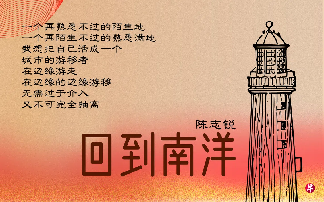 陈志锐的《回到南洋》,通过对南洋的描写,寻找自己在这个既熟悉又陌生、既安静又喧嚣的城市中的自我定位;诗中的“南洋”不是一个地理位置的“南洋”,而是一种特定文化状态的“南洋”。