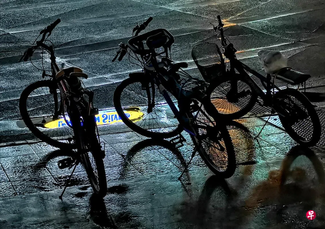 类似影像常在不同地方重现,在雨夜狮城,一场连日炎热后的骤雨,刷刷地把心中苦旱一洗而空,之后,长街被滋润,释放出心中清亮,再然后,我看见那排深情脚踏车,正拥着未央的夜。
