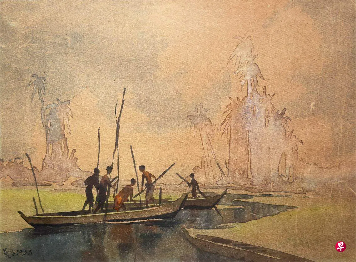 生于古晋的杨曼生擅长描绘马来亚生活的日常。作于1938年的水彩画《乐园》,人们划小船沿着蜿蜒的河驶向远方的参天大树,从笔触和色彩变化的细节,营造出氛围意境。杨曼生写下标题的《一见钟情》,是少见的人物具象作品,采用独特的素材——甘蔗渣纸,描绘一位男子被女士吸引的回眸神态,带有油画浑厚感。