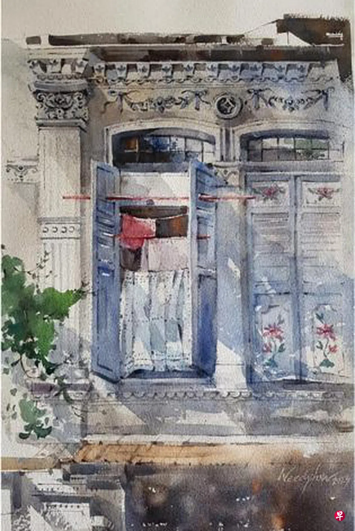 主修西画的刘奕村曾是平面设计师,现任职《联合早报》美术员十余年。她热衷于用水彩来表现大街小巷、甘榜和名胜,近期喜欢画老窗口,透过水彩的光影,明暗对比,表现出老窗口的典雅美丽,融合西方与特有南洋风格瓷砖图案的在地建筑特色。她曾获国际青年美展优秀奖、首届当代女画家国际水彩网络展三等奖,入围IMWA“Colour Asia”国际水彩奖,也是新加坡水彩画会、新加坡艺术学会和南洋美专校友会会员。