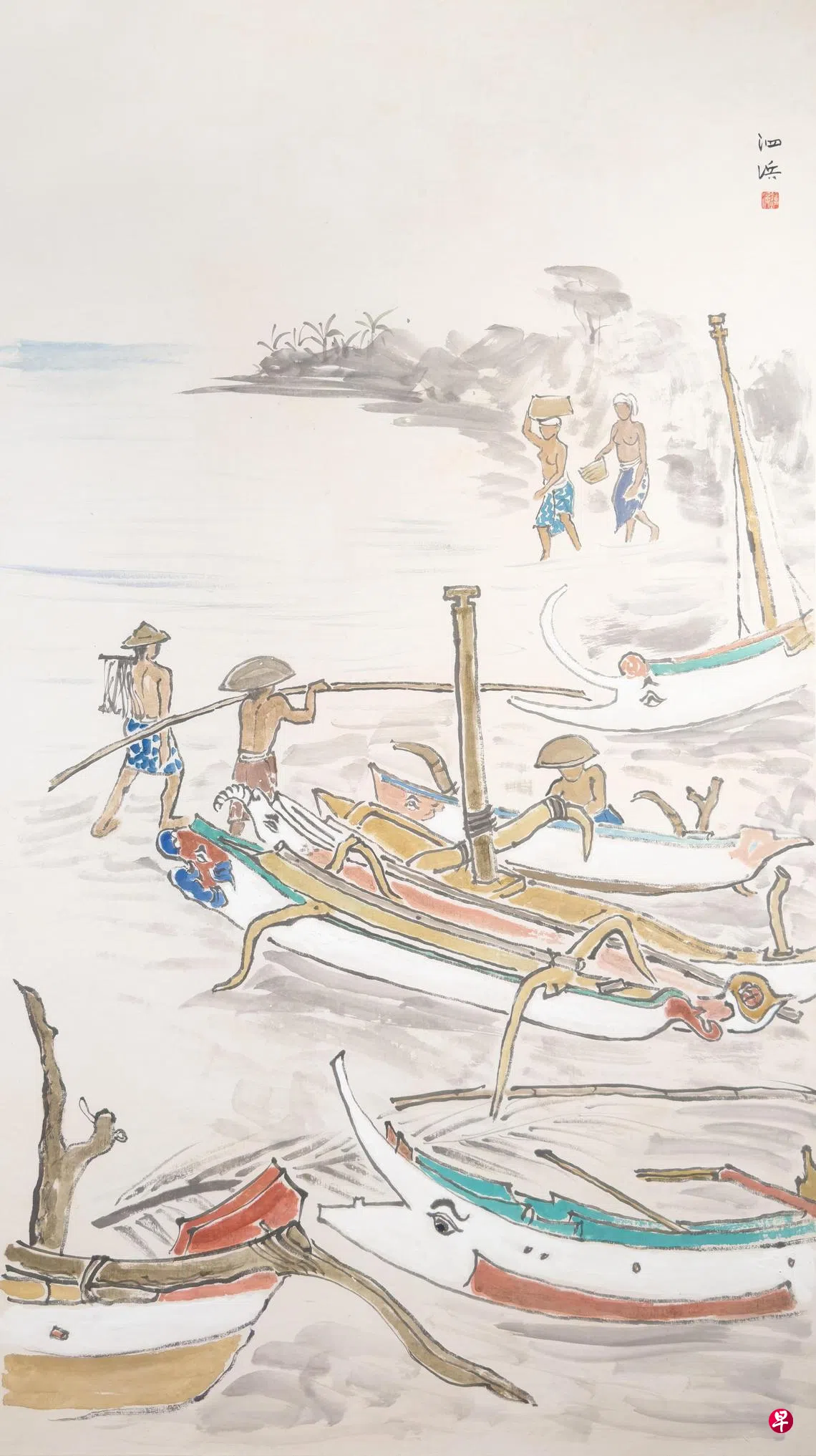 焦点展品为锺四宾早期与晚期的水墨画:巨画《海边归舟》(1952)以中国水墨画笔触线条,勾勒靠海为生的渔民和停泊岸边的船只,色彩明朗;《阿里山仕女图》(1981)描绘台湾中南部原住民邹族仕女两名,在竹纸上作画后,裱在插着两根仿中国卷轴的藤条的黄麻纸上。