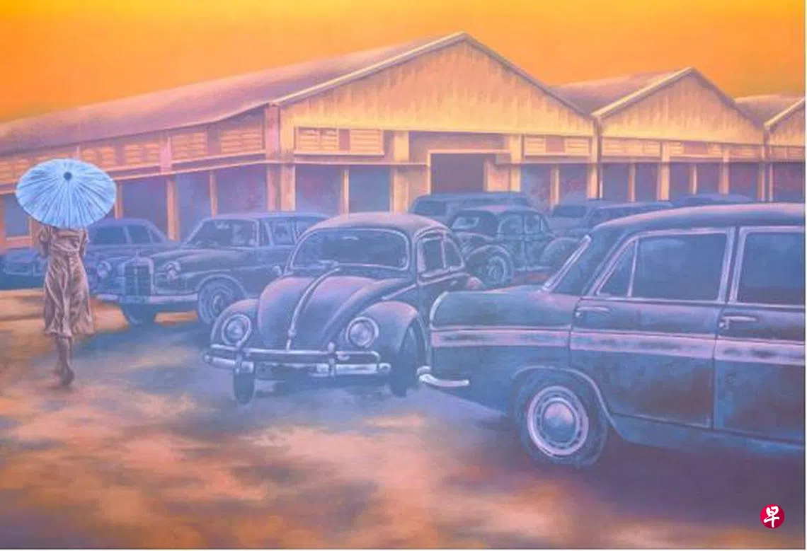 沈家琪考获南洋艺术学院纯美术文凭、拉萨尔艺术学院—伦敦大学金史密斯学院纯美术硕士,曾任中学美术老师八年,2021年起全职作画。她深入研究历史文献、国家档案馆的照片和叙述资料,重构当年辛劳忙碌的女工身影。那时新加坡被官宣为创业投资热点,每星期有一家新工厂开幕,新闻照显示,乘坐外国进口轿车的部长主持开幕。沈家琪在《空气中弥漫着奇观》刻画了工厂外停满的各型轿车,与一位撑伞走路的女工背影形成对比。《褪色的狂欢》显示了开幕礼狂欢的短暂,工作才是正经事,庆典饰品被丢弃,荒草占据了轿车与工厂外的空地。