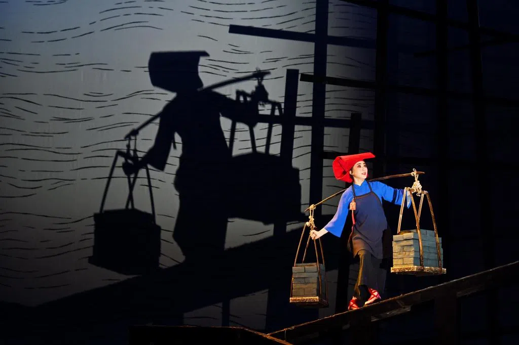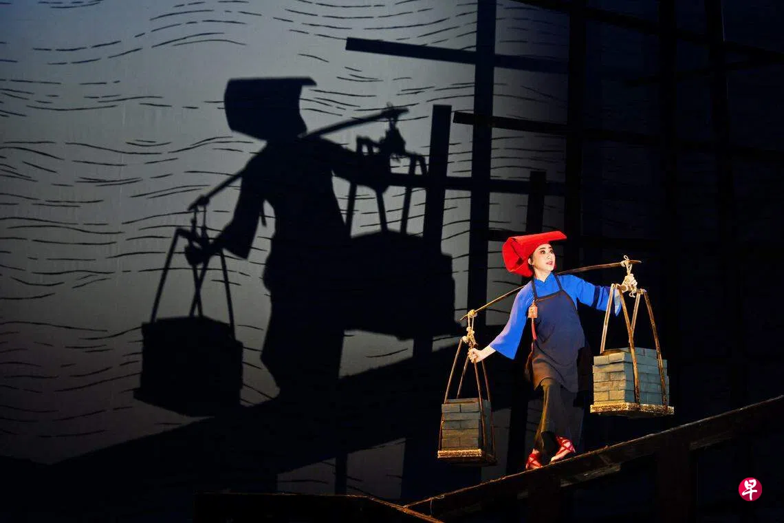 “命生好丑唔怕捱,几大都要捱过来”这一旋律宛如主题曲,贯穿于个人故事和群体场景中,点明了全剧的核心:红头巾以乐观的心态面对各种苦难。务工一场中,年轻姑娘们弯腰担砖石,灯光投射出高大的影子,“捱啊捱”的旋律与劳动号子完美融合,响彻全场,令人动容。