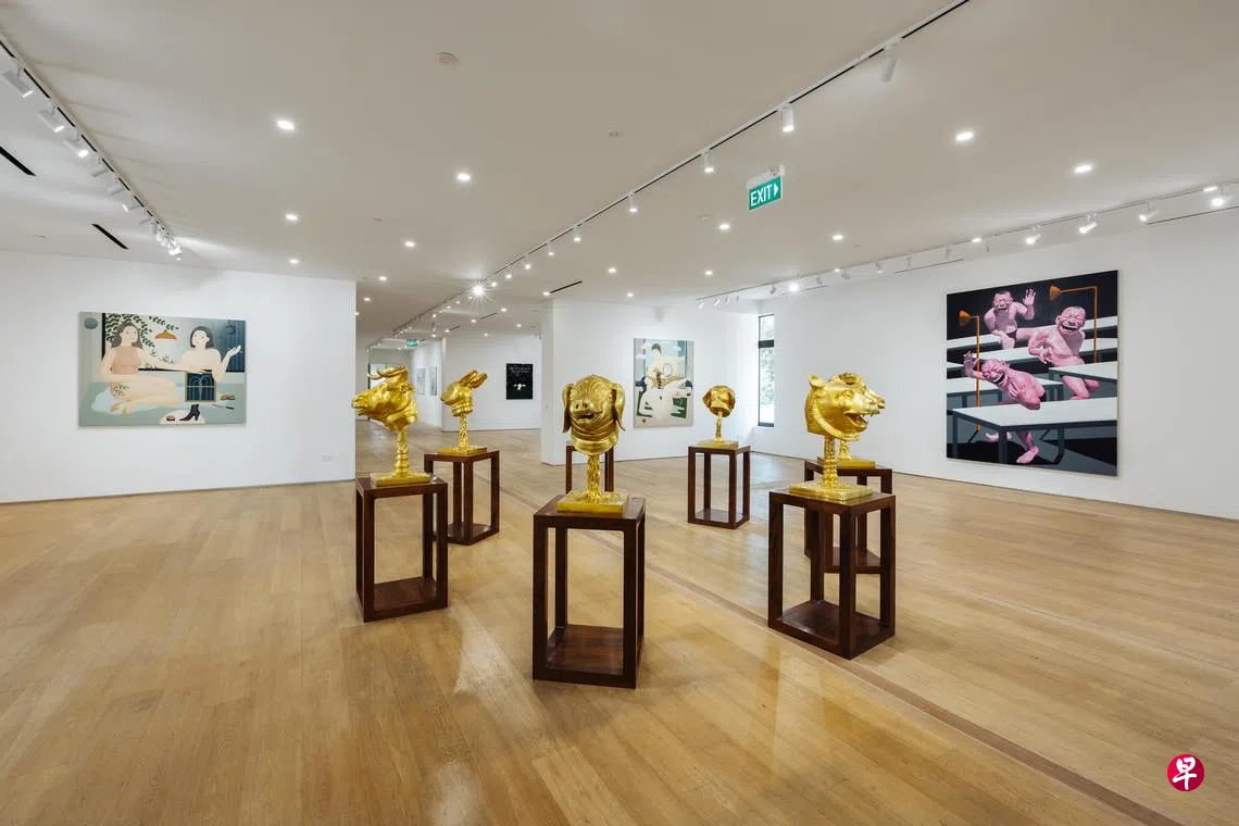 开幕展“模糊的昨天,注定的明天”展出17位当代艺术名家与年轻才俊的作品,通过对比未来的确定性与过去的复杂性,为观众提供全新的艺术见解。著名艺术家有中国艾未未的包金雕塑《十二生肖》(2010),以消失的圆明园皇家园林十二生肖报时喷泉之兽首铜像为原型(出自郎世宁之手)创作而成,原版鸦片战争后惨遭抢夺。玩世现实主义关键人物岳敏君的布面丙烯《羞》(2023),透过夸张的笑脸人,以戏谑讽刺方式反映身处现代社会和人性的困境。