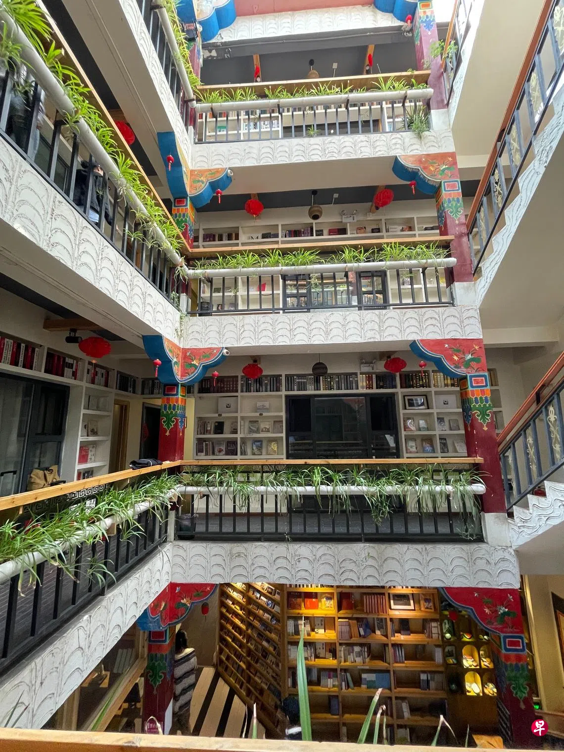 顺楼梯而上,楼上三层,走廊左边是客房,紧挨走道与客房的墙全是书架,摆着各样的书。右边是围栏,沿着围栏种着绿植,走廊柱子上有西藏风格的图画装饰。整体呈回字形设计。