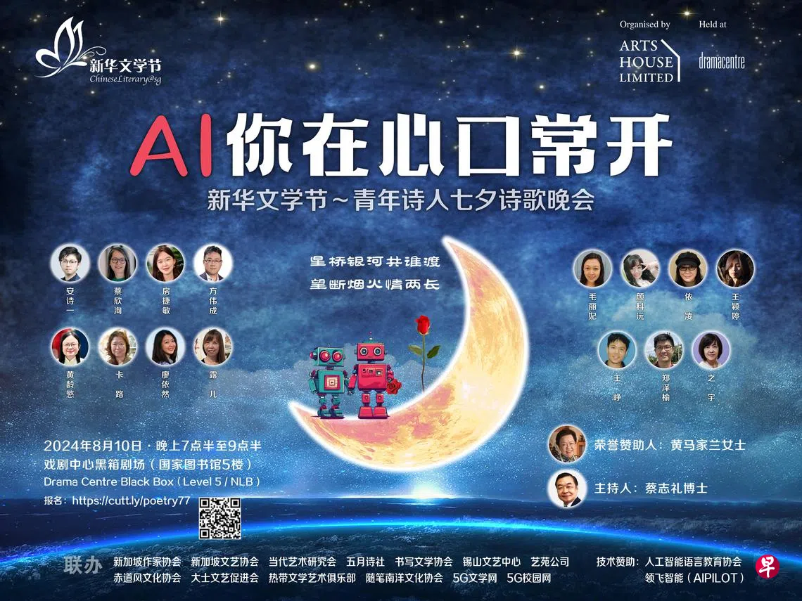 配合新华文学节,新加坡多个华文文学与文化团体将联合艺苑公司,在七夕夜呈献“AI你在心口常开”青年诗人七夕诗歌晚会。