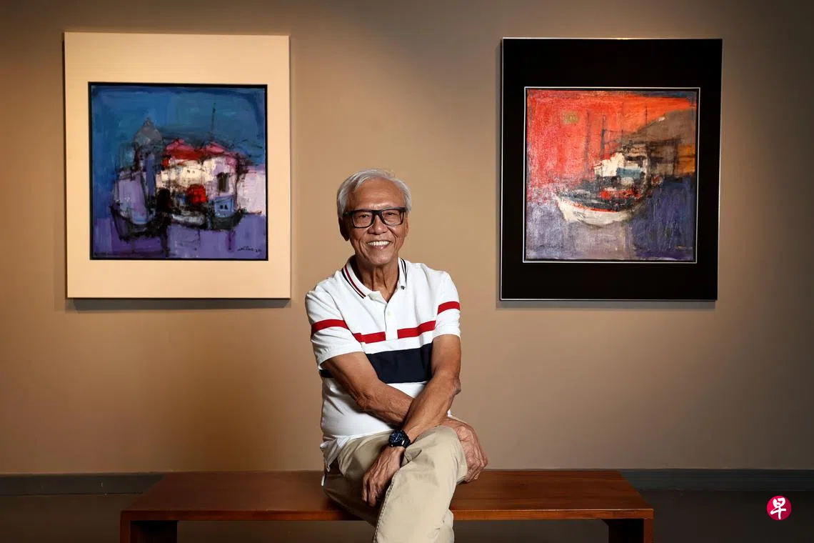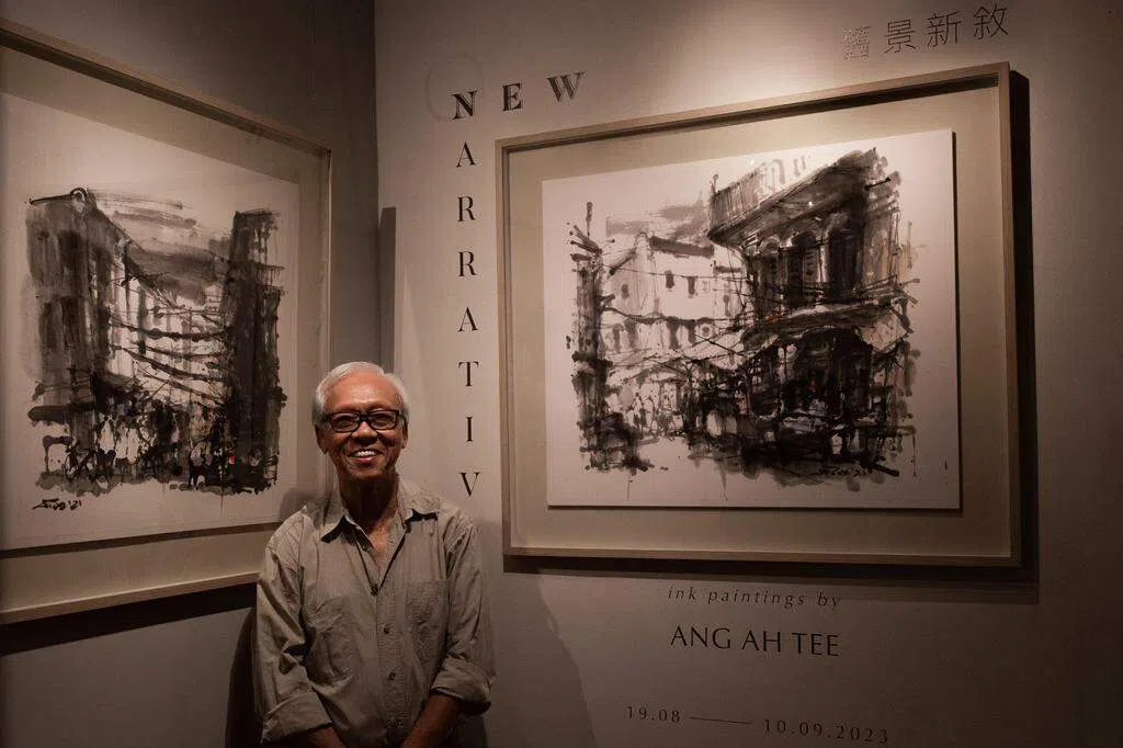 展览展出1980年代混杂水彩和亚克力颜料,用干笔在湿纸所作的混合媒介《新加坡店屋》和《中华总商会》,静态画面中带动感与活力。当他从油彩转向亚克力颜料时,最初以纸本实验,后才转向帆布画面。他说:“我作画讲究速度,亚克力比油彩颜料快干,而且没味道。”