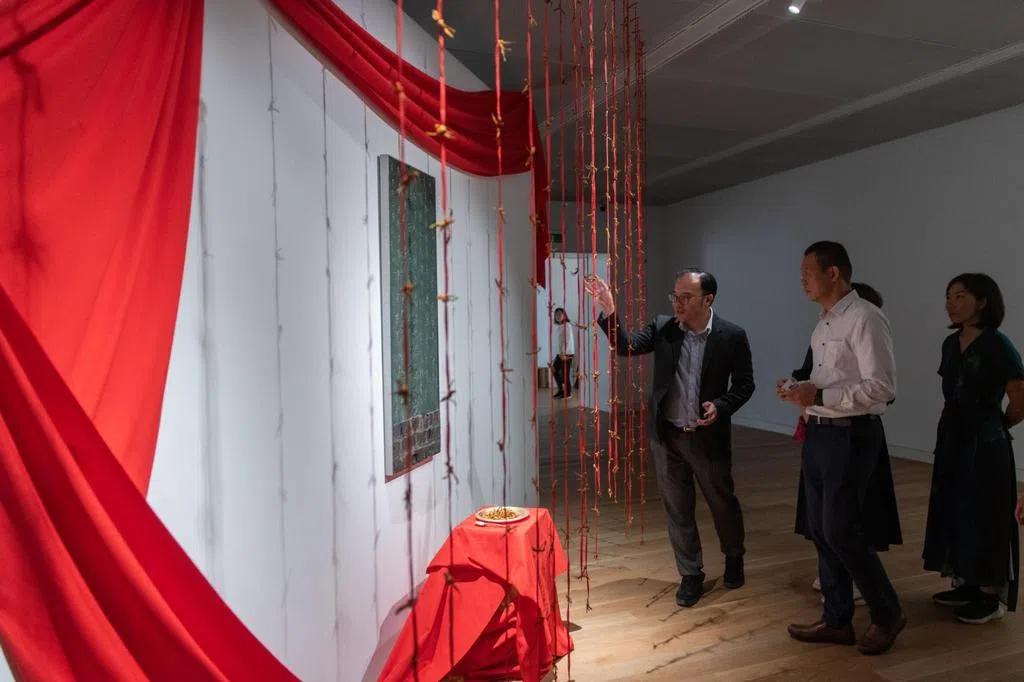 台湾黄文英的雕塑是一件《制服》,以金属经纬线织成布块后,裁剪缝制成立体作品,再以电脑提花手织机织出写实的图像,再缝制出儿时照片中的制服款式——她是穿学生制服参加叔叔的婚礼的。新加坡王良吟的《消失》也由一件件漂浮的女婴白洋装构成,“女婴”的缺席强有力地批判了中国传统文化重男轻女观念导致的“杀婴”行为。出现丧礼上的一条条红线欢迎观者拉下,阅读并反思附在红线上,艺术家通过便条传达的想法。