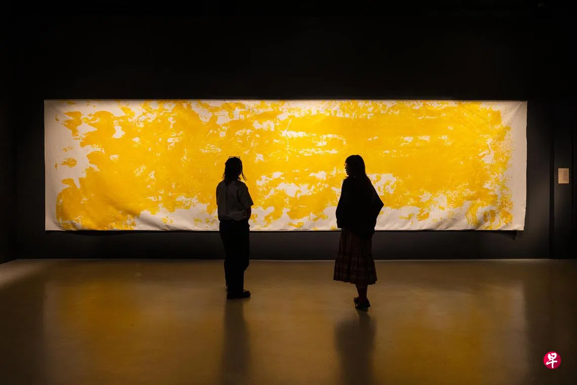 展览呈献七位当代艺术家共九件作品,包括美术馆馆藏新加坡文化奖得主、行为艺术家李文(1957-2019)的大型丙烯画《改写人体测量学:黄色时期(仿伊夫·克莱因)之第2号》(217x710厘米),既是绘画,也是档案材料。李文1998年在中国成都首次表演《改写人体测量学》,呈现了非欧洲中心主义视角,同时加入亚洲元素——中国传统五声音阶,并与女模特儿一同表演,质疑克莱因原作中隐含的性别政治。第二场2008年在新加坡斯民国际艺苑现场完成,两男一女在多元音乐中即兴演出,将黄漆涂在身上,然后在布上滚动,留下了身体印记。
