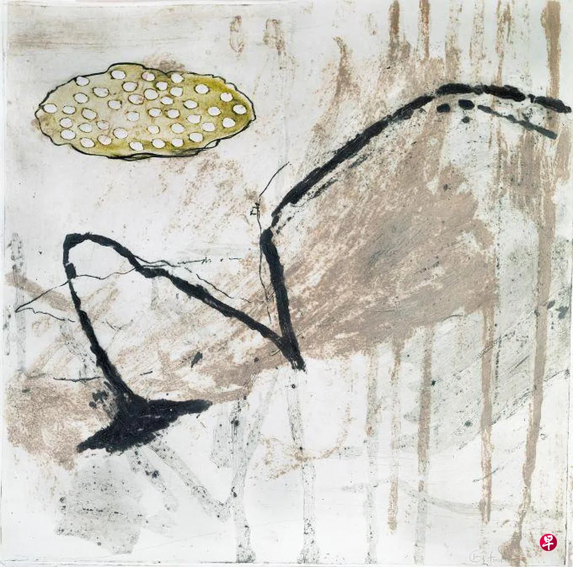 毕业于南艺西洋画的黄娇娥,在英国斯莱德美术学院主修版画。她的新系列暗示了人们经历了的、丢失或发现的自然痕迹。纹理、线条、标记和点优雅地分层和同步驻留在表面上,但又像日常反思、记忆和渴望的有形残留物一样令人痛苦。不少作品借鉴了中国水墨画元素,笔触流畅多变,水墨氛围细腻有韵味。艺术家是通过蚀刻的痕迹来定位短暂和难以捉摸的事物,邀请我们探索这些看似对立但又相互依赖的品质的交叉点。