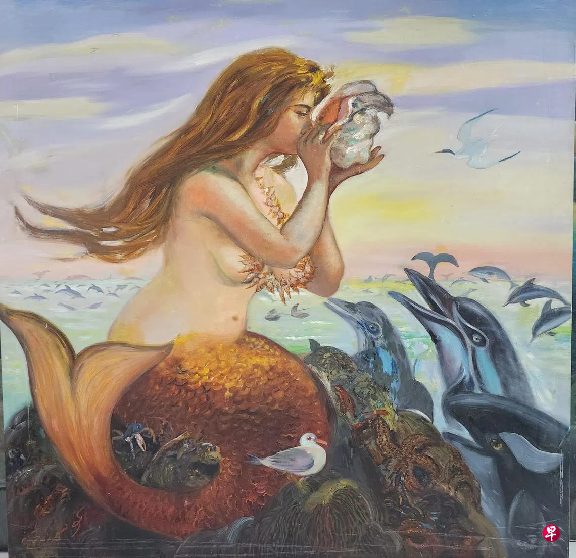 本次展览以保卫海洋为主题,首次展出画家以前创作的与海洋相关的油画。许锡勇受访时说:“从以前,我就感觉到海洋的重要性。日本福岛核电站污染水泄漏事故对海洋产生很大影响,全世界应该重视海洋被毒害的问题。海底有各种鱼类和生物,为人类提供吃食。海洋也有许多神话传说,比如美人鱼。我通过油画《保卫海洋》,以美人鱼吹海螺和海豚等生物围绕的景象,来传达人类与海洋生物共生的关系。”