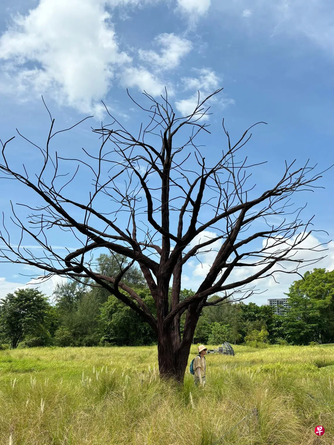 上网查询,此雕塑的灵感来自裕廊工业区的起源,材料是从旧裕廊湖公园内的小径回收的铁条。原来,“孤树”的前世与今生都离不开现代工业。园林设计师费尽心思的创意,却碰到对现代性满脑子批判意识——“所有坚固的都烟消云散”(All that is solid melts into air)的我,徒劳了。现代人确是活在吊诡与矛盾之中,自觉或毫无觉知,就看个人造化。