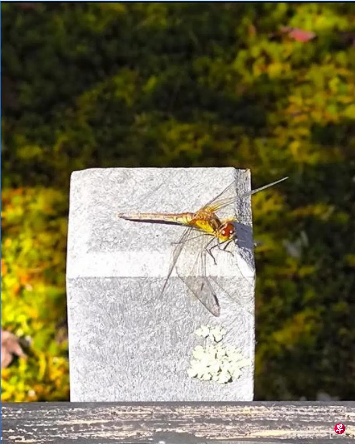 注:在日本东近江的永源寺里,见小石柱子上有只蜻蜓,陷入了沉思中,宋·李之仪有《咏苍髯》诗, “青丝白发一瞬间,年华老去向谁言。春风若有怜花意,可否许我再少年。”当然,不行!