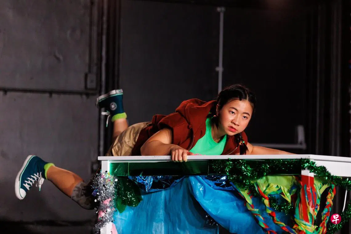 整场演出以轻松幽默的动画式叙述展开,通过多媒体、灯光与空间设计,展现出雪儿鲜明的性格特征——一位为梦想四处奔波的自由剧场工作者,同时也是一名“斜杠族”。剧中快节奏的情节与雪儿不断追不上巴士的画面,揭示了她所处的高压环境,并为她最终的情绪崩溃埋下伏笔。