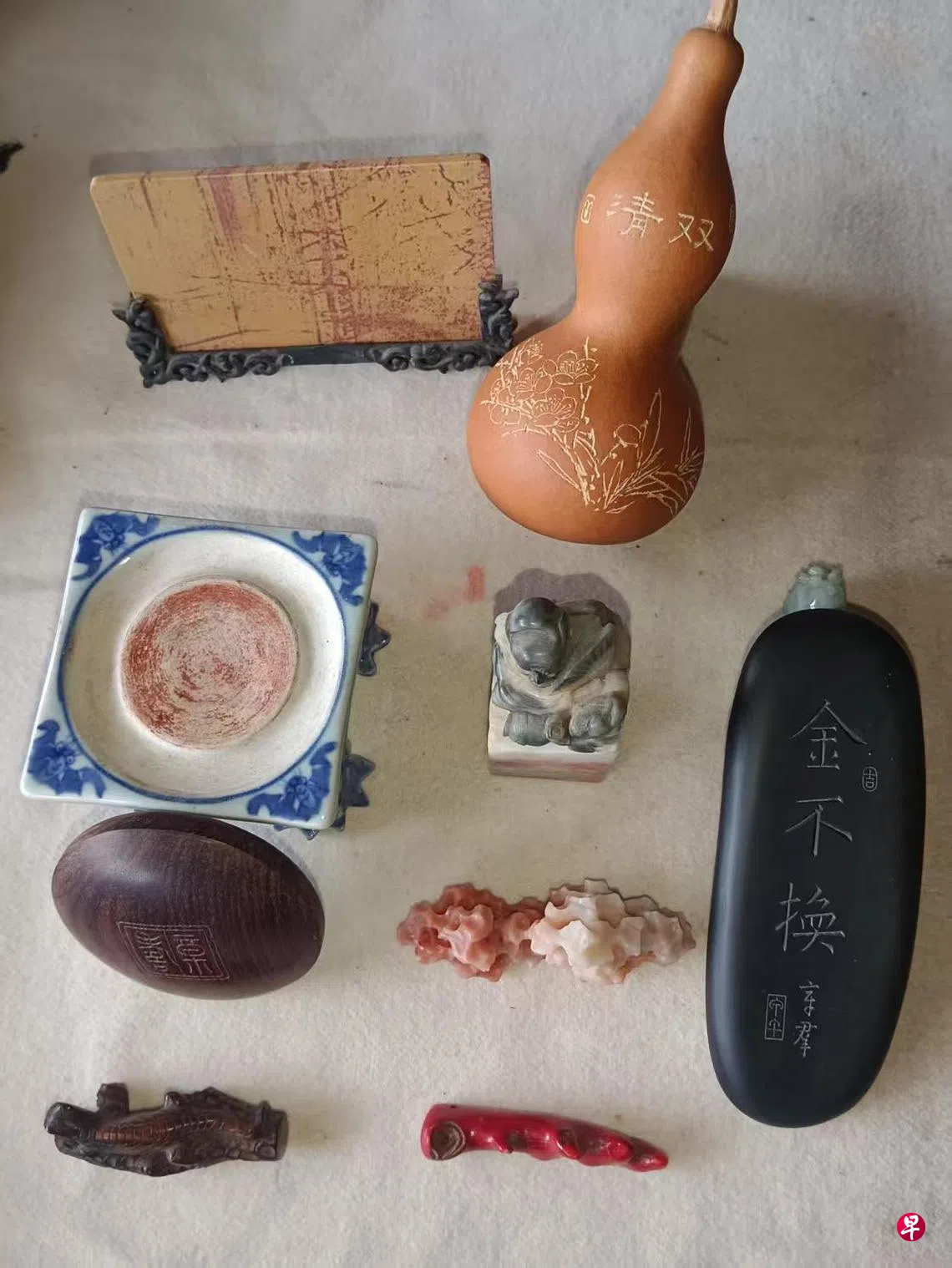 章群本次展出的印章,以玉、水晶、玛瑙等闲章为主,约60方;寿山,青田等石印约30方,其他印章若干方;书法立轴,色卡镜框大小约20余件;端、洮河、红丝等砚台七件;其他笔搁、笔洗、镇纸等若干件。