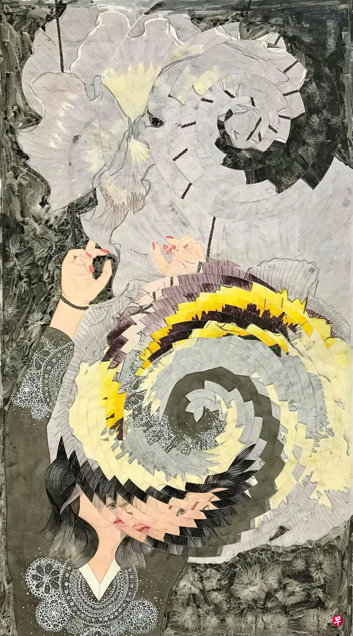 第一系列“生命的自我叩问”是艺术家以画笔探讨存在的意义,强调艺术创作是灵魂的表达,通过人文思维与生活智慧的积累,展现对美与自由的永恒追求。第二系列“最美的距离”以古典雕像为剧场背景,当代女性为主角,通过新古典主义的理性构图与笔触,颠覆传统情感表达。画面中永恒的静默与瞬间的冲动碰撞,呈现庄严与活力的奇妙共生。第三系列为水墨的当代解构,以宣纸为基础媒材,融合拼贴、重组东西方肖像传统。艺术家拆解画作、重叠造型,挑战观看模式,探索女性与花意象下的情感深渊,展现阴性能量对固有秩序的松动与重塑。黄煦倩说:“艺术是我凝视深渊,亦被深渊回望的旅程”,并将诠释权交予观者,期待与观众展开开放的思维对话。
