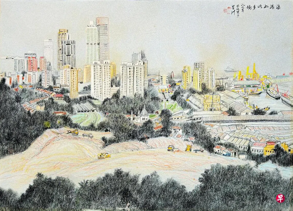 林木化生长在社会动荡、建国发展的年代,结合中西绘画技法,通过写实与叙事式创作反映社会现象、本土风景、日常生活、消失中的行业等。他富实验精神,创作媒介包括油画、炭笔画、粉彩画、版画、水墨画。本次展出纸本混合媒介《海港远眺》(1989)是从花柏山俯瞰海港,描绘铲泥机清理出山坡,大自然让位给住宅区发展。