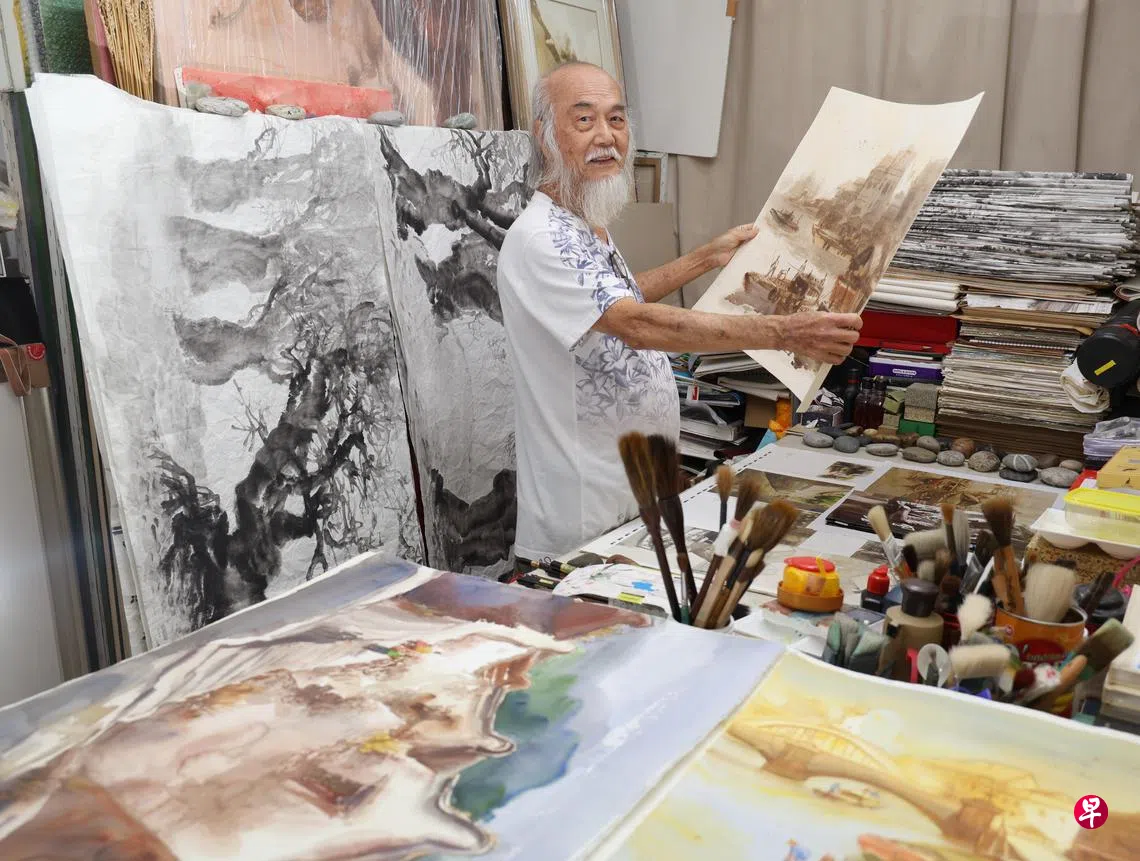 刘培和与太太位于金文泰的五房式组屋住家化身画室与储藏室,累积了两三百张水墨画和两三百张抽象画,还有不少水彩画、油画、速写簿等,可见他不仅是水彩画高手,创作媒介也很多元。
